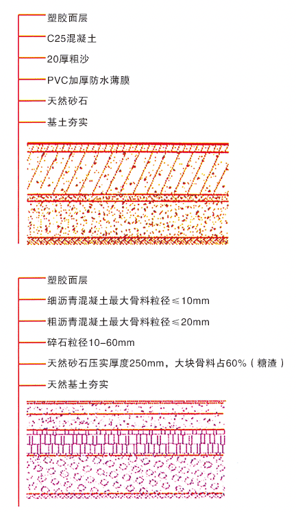 復合型塑膠跑道:底層用聚氨酯單組份膠水混合黑色橡膠粒攤鋪,施工方法同透氣型。面層用聚氨酯雙組份材料加入填充料現(xiàn)場澆注而成,施工方法同混合型。